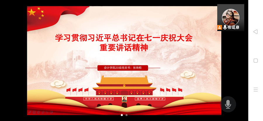 7月29日,万象城allwincity官网20级学生党支部于线上召开专题学习习近平总书记“七一”重要讲话精神线上会议,支部书记张玮桐主讲,党员段姣、孔德瑜参与此次会议。
