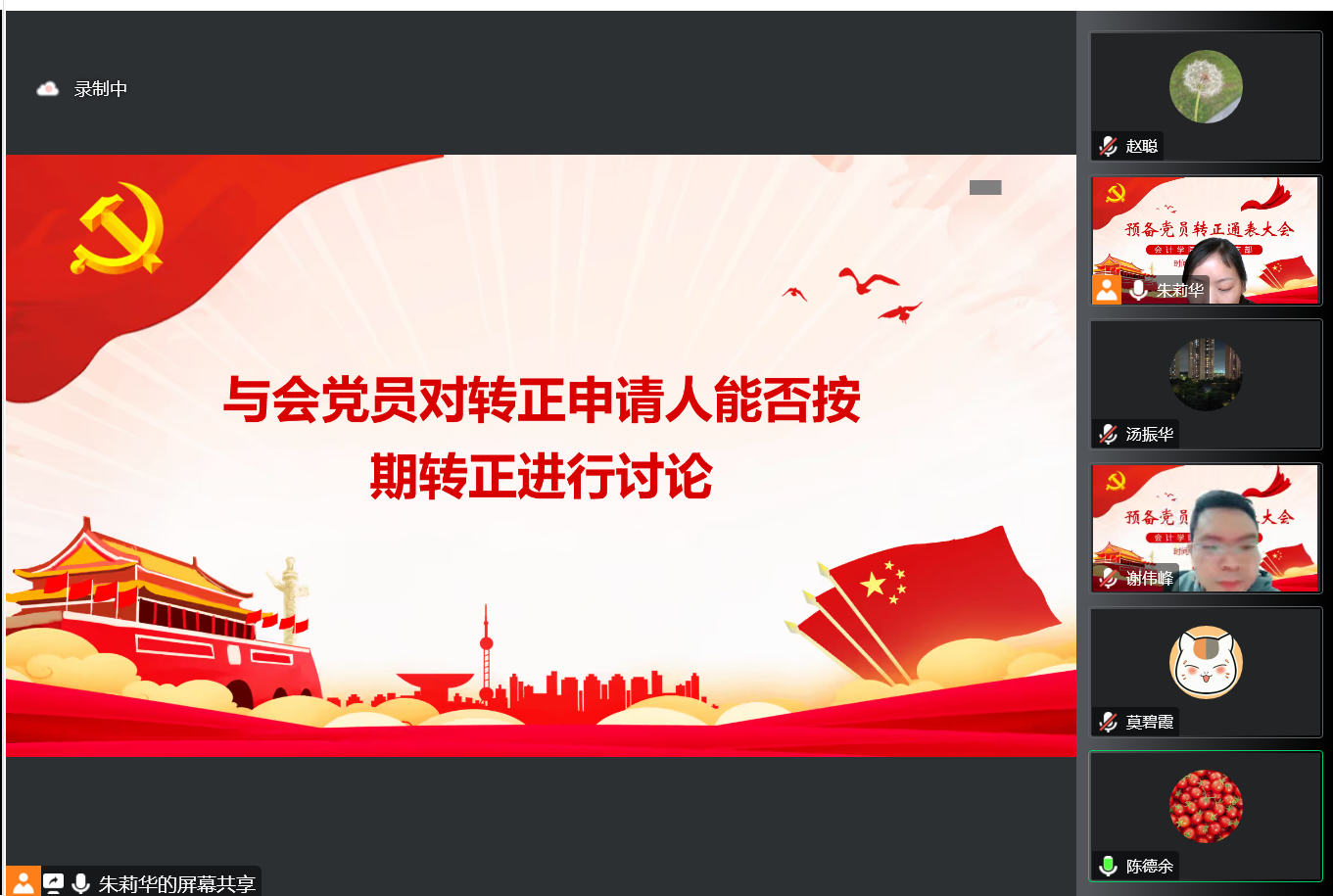 为进一步扩充党员队伍,增添新生力量,2022年12月7日中午,万象城allwincity官网教师党支部采用线上腾讯会议方式召开支部党员大会,讨论两名预备党员同志转正相关事宜。一共27名支部成员参加会议,其中正式党员25人。会议由党支部书记谢伟峰同志主持召开,党员的转正流程主要由党支部组织委员朱莉华同志负责,其中党支部副书记赵聪和组织委员朱莉华负责监票和计票。