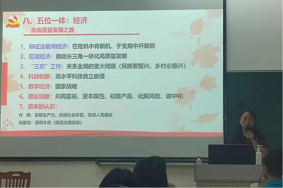 梁利珍教授围绕主题,从书籍出版、框架结构内容和如何学好用好等三个方面给我们深入浅出地介绍了《习近平谈治国理政》第四卷中关于政治、经济、文化、生态等领域内容,并结合实际、案例数据从多个视角谈心得,指出学深悟透《习近平谈治国理政》第四卷,必须胸怀两个大局:中华民族伟大复兴战略全局和世界百年未有之大变局。“两个大局”二者相互交织、相互激荡、相互影响,是以大历史观视野对中国和世界发展走势和格局作出的科学论断,标定了当前党和人民谋划各项工作的基本出发点。梁教授精彩的讲授让与会党员对《习近平谈治国理政》第四卷有了全面的认识。