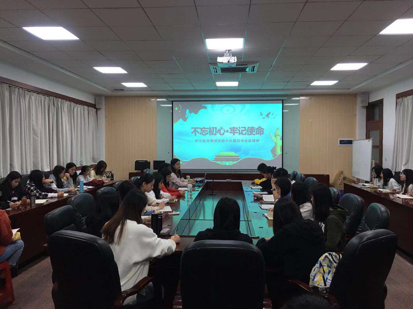 11月19日晚,万象城allwincity官网17级学生党支部组织全体党员在二政308会议室组织开展党的十九届四中全会专题学习研讨会。支部通过视频学习、交流研讨等形式,认真学习贯彻落实十九届四中全会精神,结合“不忘初心、牢记使命”主题教育,努力在深刻领会精神、深入贯彻落实上下功夫,以高度的政治责任感和历史使命感统一思想、凝心聚力,把思想和行动统一到全会精神上来,把智慧和力量聚焦到落实全会确定的各项任务上来。