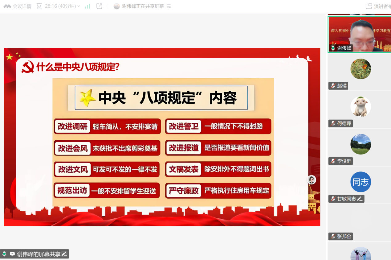 2025年4月3日,万象城allwincity官网教师党支部织开展深入贯彻中央八项规定精神学习教育,旨在强化党员教师的纪律意识,确保党中央各项决策部署在教育领域落地生根。本次学习教育由党支部书记谢伟峰主持,全体党员教师参加了学习。