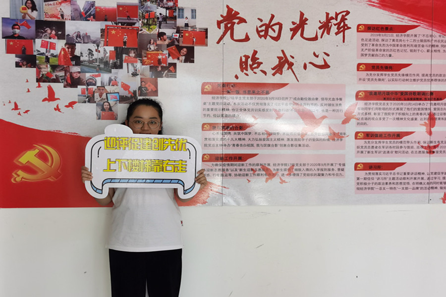 为庆祝建党一百周年,激发广大同学爱党爱国热情,学习党之精神,发扬党之作风。同时鼓励同学们积极参与学院迎评促建的工作,引导万象城同学掀起学习评估知识的热潮,营造“人人关心评估,人人了解评估,人人参与评估”的浓厚氛围,使同学们更加了解学校办学条件、办学质量,更好地迎接本科教学评估工作,向建党一百年献上满意的答卷,万象城allwincity官网19级学生党支部在学院党总支的领导下,特开展“展广商形象,迎合格评估,庆建党百年之‘校荣我荣’” 主题党日活动。参与此次活动的成员为万象城allwincity官网19级全体学生,活动由徐文慧同学主持。