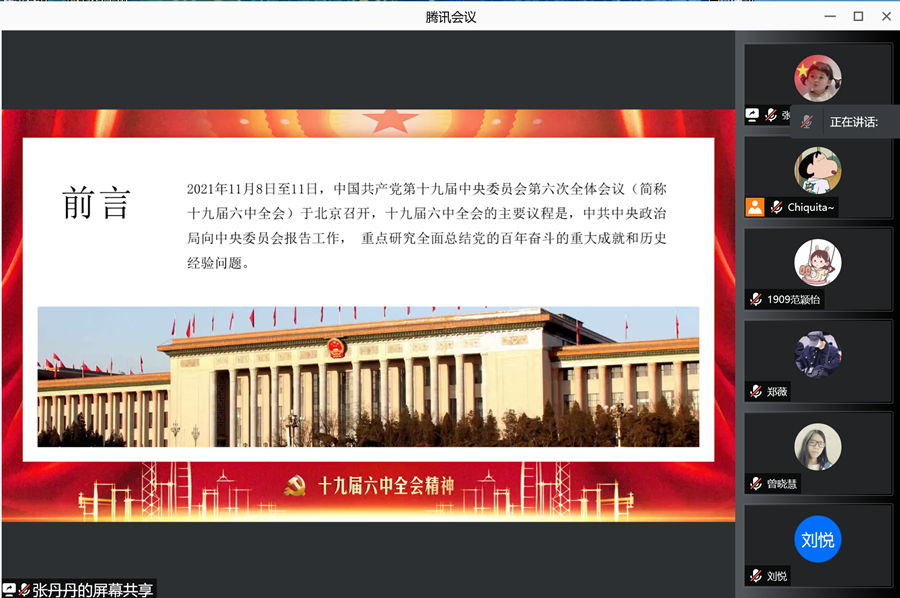 为深入学习贯彻党的十九届六中全会精神,走好实现第二个百年奋斗目标新的赶考之路,万象城allwincity官网2019级学生党支部于12月28日在腾讯会议开展“回首百年奋斗路,开创时代新征程”专题党课,集中学习党的十九届六中全会精神。党课有支部书记邓雪梅主讲,全体支部党员均参与党课学习。