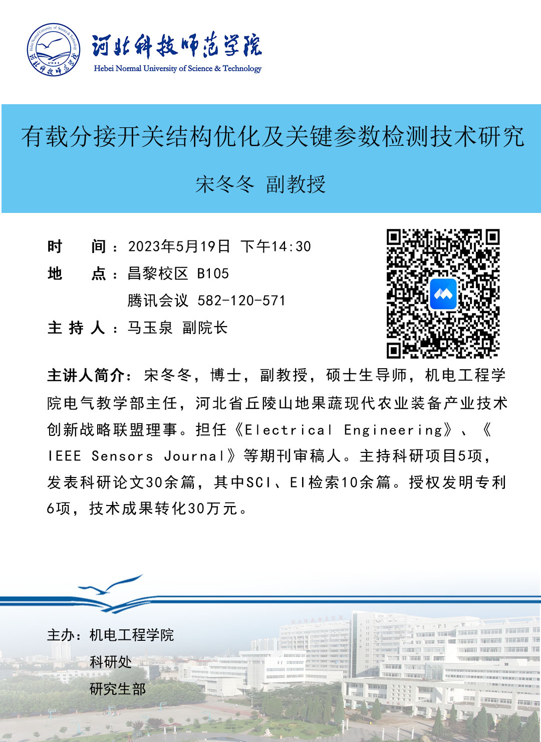 主讲人介绍:宋冬冬,博士,副教授,硕士生导师,BB贝博艾弗森官方网站电气教学部主任,河北省丘陵山地果蔬现代农业装备产业技术创新战略联盟理事。担任《Electrical Engineering》、《IEEE Sensors Journal》等期刊审稿人。主持科研项目5项,发表科研论文30余篇,其中SCI、EI检索10余篇。授权发明专利6项,技术成果转化30万元。