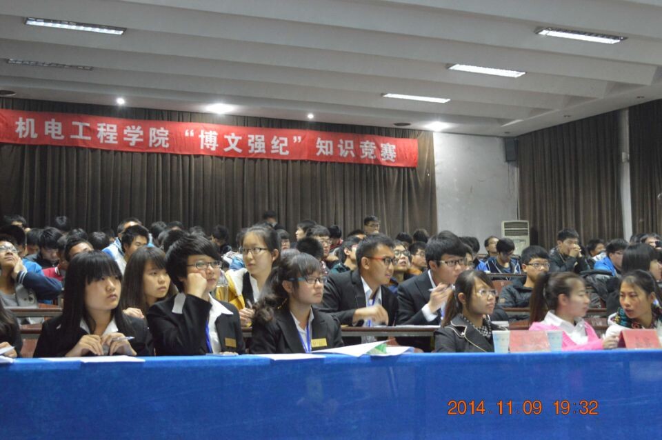 2014年11月9日晚上7点,BB贝博艾弗森官方网站在2号阶梯教室举行了“博文强纪”知识竞赛。出席活动的有学工办主任张丽玲老师、分团委书记郑建华老师,学生会主席团以及2014级学生。本次知识竞赛的范围是百科知识和学生手册,旨在扩大同学们的视野,提升大学文化素质,加强同学们对校规校纪的认识,促进学风建设,营造浓郁校园学习氛围。竞赛的主要环节有:必答题;判断题;移花接木题;抢答题;风险题。每个专业派出三个代表参加,分为个人赛和团体赛。为了调动现场气氛,其中穿插观众互动环节。经过激烈的角逐,14级电气工程及其自动化专业代表队获得冠军,14级机械设计制造及其自动化代表队获得亚军。此次竞赛不仅丰富了同学们的知识积累,同时也锻炼了同学们的团队协作能力。