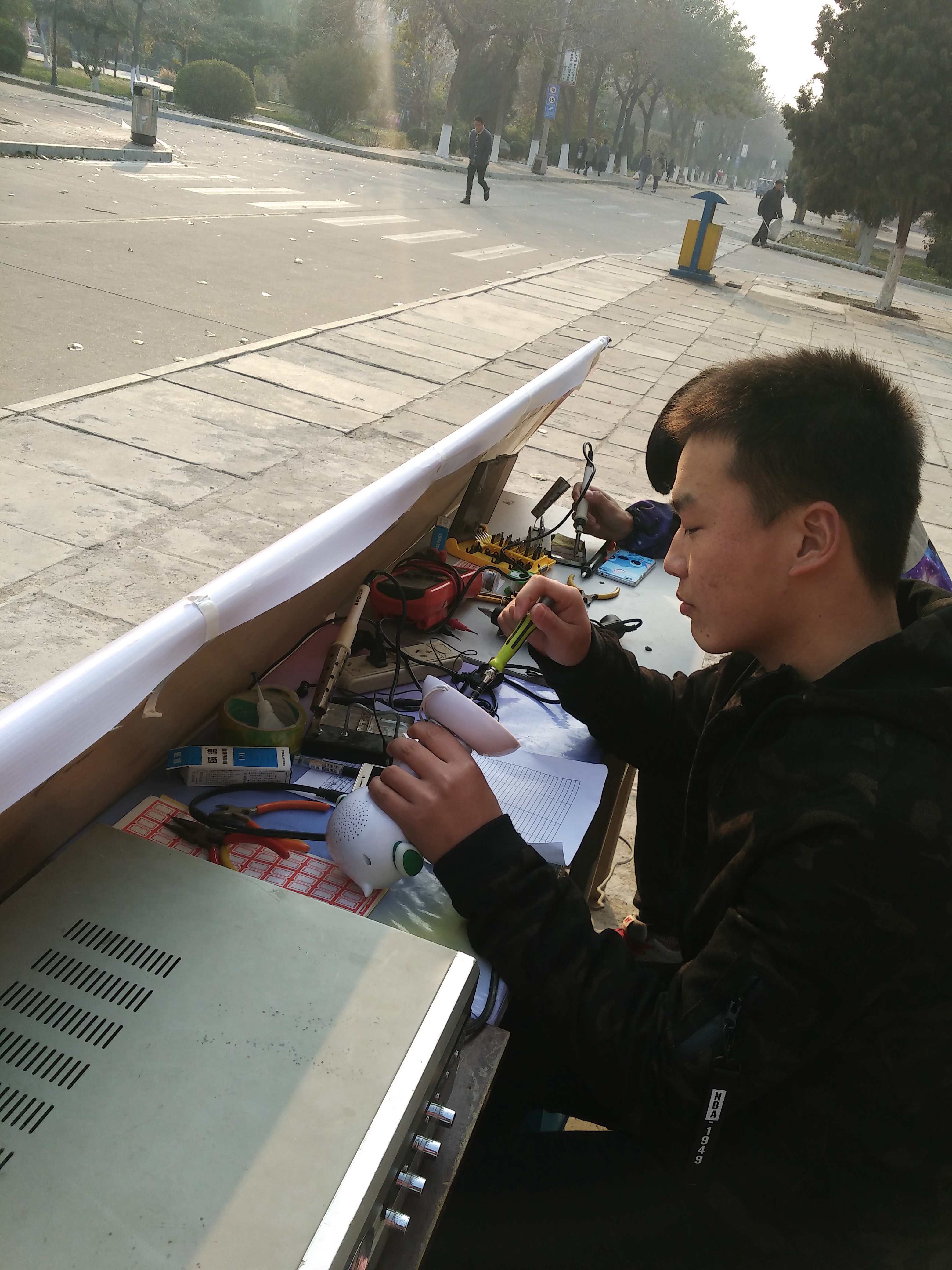 同学们结合专业知识拿着工具“真枪实干”,为学校的师生、附近的居民修理家用电器,奉献爱心。