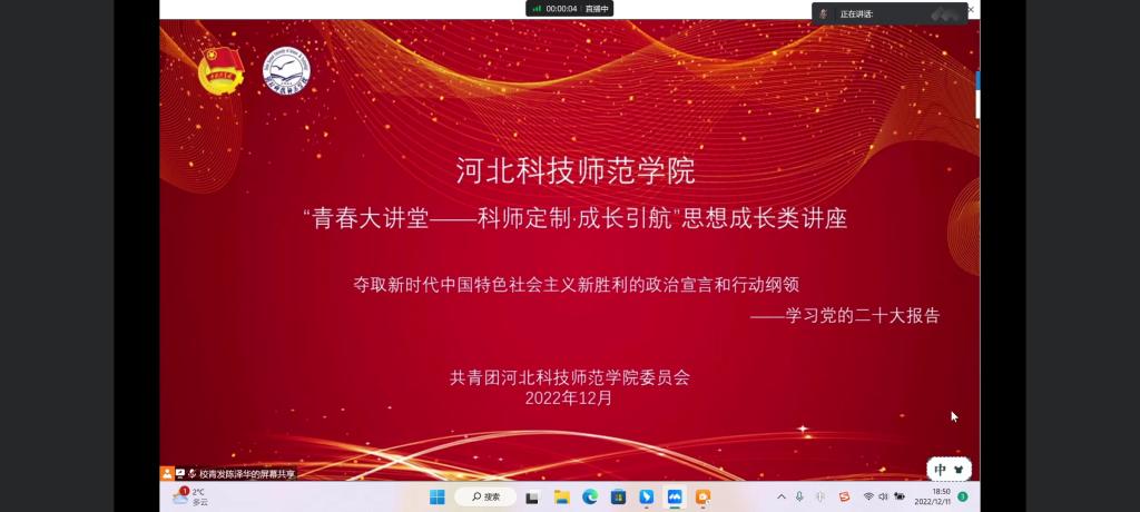 2022年12月11日晚,BB贝博艾弗森官方网站开展青春大讲堂思想引领类讲座。本次讲座学习了党的二十大报告,讲解了关于夺取新时代中国特色社会主义新胜利的政治宣言和行动纲领。