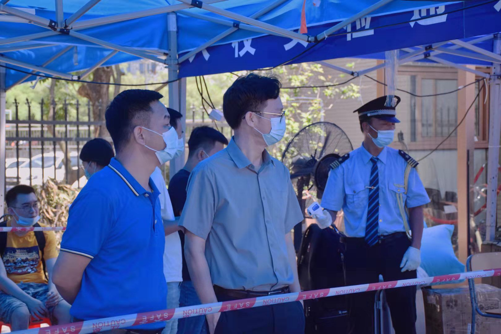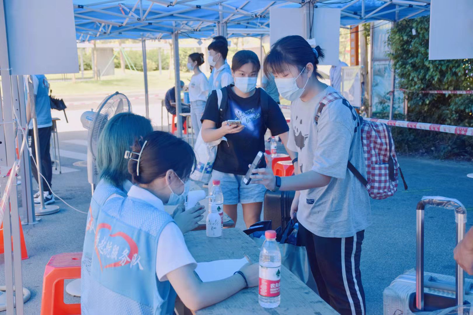 报到当天,在北门入口,志愿者引导返校学生到学校门口的安检通道对行李进行喷雾消毒、手部消毒,配合进校前体温检测和核查身份,并帮助返校学子搬运行李,展示青年学子朝气蓬勃面貌,为学生提供温暖贴心的服务。学校为志愿者工作人员准备绿豆糖水降温防中暑。校院严格把控学生返校各个流程的工作,确保学生安全,让学生感受到回家的温暖。