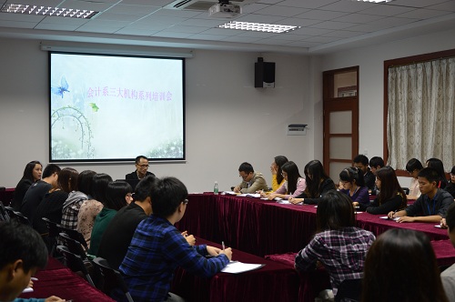 会议伊始,陈秀纯老师回顾了过去会计系三大机构“大满贯”的辉煌佳绩,介绍了会计系三大机构系列培训会的目的和安排。