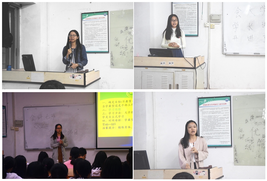 本次学长讲师团包括获得国家奖学金学生、优秀学生干部、优秀党员等,在分享前,万象城allwincity官网团委书记蓝乐钿召集全体讲师团成员进行集体备课,分析低年级学生在学习生活中的特点,向讲师们提出分享经验的侧重点。“会大学”讲师团讲师结合各班情况,与低年级学生分享学习生活、干部经验、入党流程等。优秀学长林小冰、邵梓晴、佘晓曼、吴翠霞向低年级介绍会计专业课程的学习方法,并介绍万象城奖学金、国家奖学金等评选条件;优秀学长马钡佳、马思远、黄亮、何思结合自己的干部经验,向低年级学生如何在工作中提升自己能力,优秀学生干部应该做到不盲目、不自卑、会总结三个方面,谨记“在其位,谋其职”的道理,认真负责任并学会兼顾班级与部门、学习与工作的关系,同时讲到“失败亦是成长”,鼓励新生们用积极的态度面对成长中的挫折,总结提升。优秀学长陈泽璇、杨利锋、丁楚萍、郑映曼则向低年级介绍入党流程,帮助新生们重塑入党动机,并和大家分享入党的感悟与收获,鼓励大家应提高自己的思想感悟,敢于担当,敢于自我批评,避免功利,不忘初心。