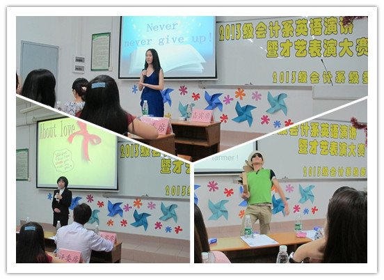 为进一步提高2013级学生早读的积极性,为13级学生提供一个展现才艺的平台,会计系于4月-5月举行13级英语演讲暨才艺表演大赛,决赛于5月18日晚在C404举行,会计系党总支书记李锦堂、13级辅导员李银霞观看了比赛。