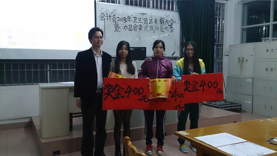 会议以上学期12级同学们清洁课室、校园环境的视频开始,对出色完成卫生清洁工作的班级、生活委员、组织委员进行了表彰。会计系学生会生活部部长陈雪芬对上学期卫生清洁工作进行了总结,指出了各班卫生清洁工作的不足并提出建议。优秀生活委员、组织委员代表分享了工作经验和收获体会。汤振华宣读了“示范宿舍”评比活动方案,详细介绍了评比的对象、条件、程序、奖励和工作要求,呼吁各宿舍对照条件,努力创建“示范宿舍”,共建美好“家园”。