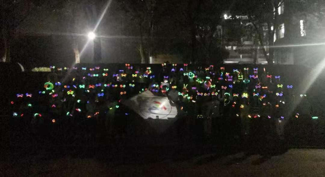 此次活动以团学部门为单位,由张振华老师领跑。众人先绕广商足球场跑一圈,然后跑至广商金贝子、广商中门、体育馆等指定地点进行打卡拍照方即可成功认证。活动开始,各部门在领取了荧光道具后,各种颜色的荧光棒汇成了一片彩色的海洋。全体团学干部先进行简单的热身运动,待开始的号令响起,开始了夜跑活动。