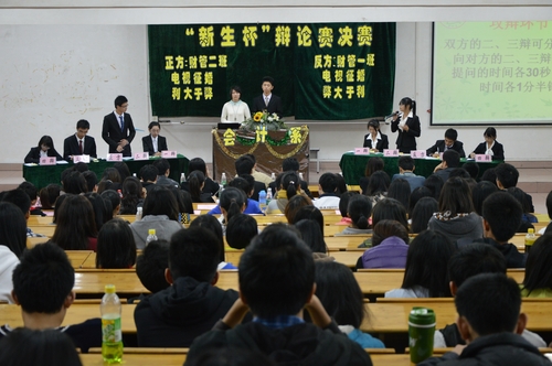 本场比赛中,正方财务管理二班同学的观点是"电视征婚利大于弊"。反方财务管理一班同学的论点是"电视征婚弊大于利"。正方一辩首先进行开篇陈词,他们从电视征婚能丰富人们的生活平台来阐释自己的观点;反方则从电视征婚产生的社会风气和对人民的婚恋观产生的影响来阐释电视征婚的弊端。在攻辩环节,双方二、三辩同学层层深入,在尖锐的提问中不忘强调本方的观点,将辩论赛推至高潮。攻辨小结中,双方一辩对对方二、三辩的攻辩进行抓漏。在自由辩论中,富有攻击性的提问,巧妙的躲闪回击都给在场观从留下了深刻的印象。最后总结陈词环节,正反两方的同学在论述过程中各有千秋,都赢得现场观众的阵阵掌声。从整个“新生杯”辩论赛脱颖而出的八位最佳辩手将现场的气氛再度推向高潮,他们围绕着“青少年的成才关键是自身能力还是外部机遇”这一辩题展开为时5分钟的较量,以最独特的方式展现了自己的风采。