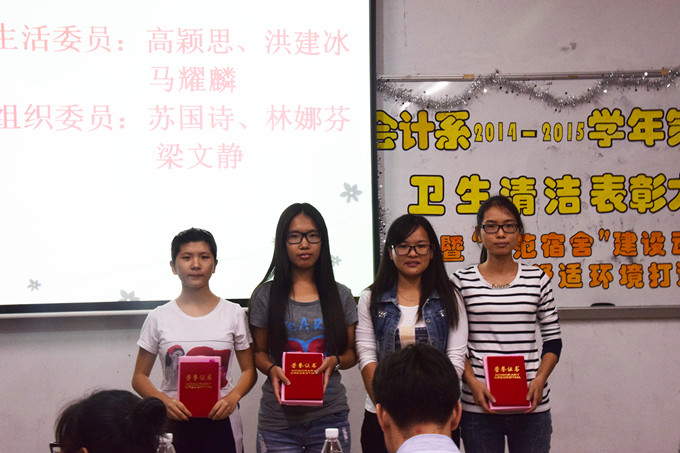 为表彰2014--2015学年在课室卫生、清洁小广告、宿舍宣传等方面涌现出的先进集体和个人,建设舒适环境,打造博雅校园。11月9日会计系在C205举办了卫生清洁表彰大会。出席本次大会的嘉宾有会计系党总支书记李锦堂、会计系15级辅导员蓝乐钿、梁小。