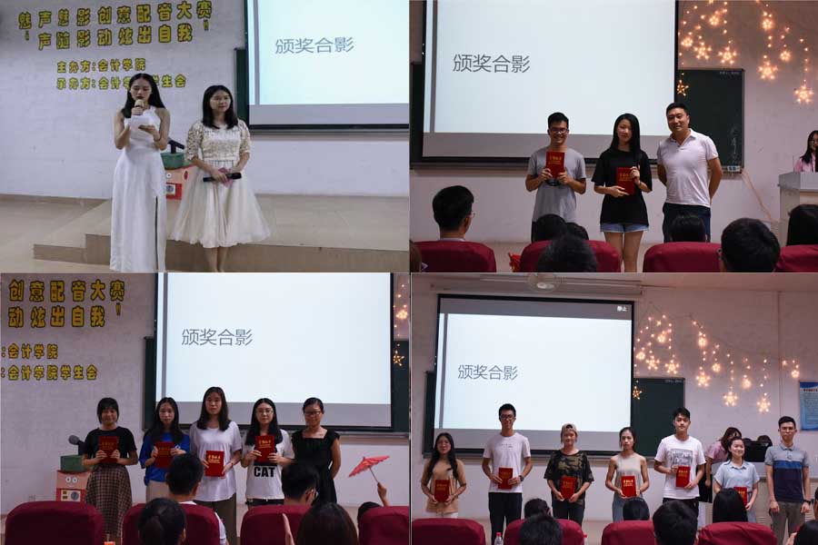 一段趣味配音《天下奥运》拉开了配音大赛的序幕。比赛正式开始,经过初赛的层层筛选,脱颖而出的有12位参赛队伍,各组参赛选手通过消音视频加入自己的独有的音色和创新元素,为在场的观众带来了一场视觉盛宴。在激烈的比赛中,第六组选手“怕水的鱼”一人饰演四角,向同学们演绎了吹飞机的故事;令人不禁鼓掌的是,在《甄嬛传》中,她真挚的情感和带有张力的表达,让观众仿似声临其境于深宫之中。第十组选手“金拱门有限责任公司广州商学院分公司”的作品《隔壁村的爱情公寓》中,他们以幽默搞笑的影片配音,激起现场观众的热情,也带领同学们一同回顾了那些年追过的《爱情公寓》。有深宫的悲情、有爱情公寓的欢笑,还有清新脱俗的动漫经典,“时光机”组合的《小新和小丸子的千寻不属于菲丽西》、爆可爱组合的《哆啦A梦》以及其余选手,他们以创新形式、丰富的感情让我们重温童年经典、也让我们感受到了声音的力量。