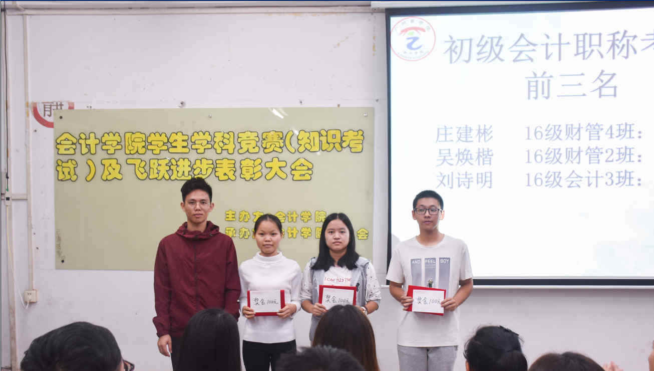 首先,大会对获得初级会计职称前三名以及英语四六级前三名的优秀同学做出表彰。他们分别是初级第一名:16级财务管理4班庄建彬,第二名:16级财务管理2班吴焕楷,第三名:16级会计学3班刘诗明;英语四级考试第一名:17级审计2班蔡淑仪,第二名:17级审计二班邓晓岚;第三名:16级会计4班吴丹敏:英语六级考试第一名:16级财务管理4班曾莉,第二名:16级会计1班陈绮华,第三名:16级审计2班罗维。