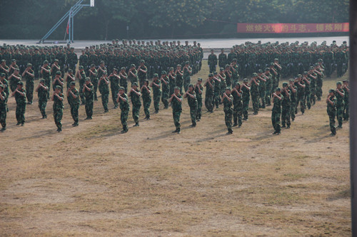 上午8点整,新生军训总结表彰大会正式开始。庄严的奏国歌、迎军旗仪式后,领导检阅了学生方队,在红旗的指引下,各方队昂首阔步地从主席台前走过。紧接着是各营各连的汇报表演,四连的擒敌拳,展现出一种巾帼不让须眉的顽强气魄,少林棍术气势恢弘,尽显阳刚之气。他们整齐划一的动作、矫健有力的身姿、雄壮嘹亮的歌声充分展现了时代骄子们的风采。拉歌环节更是精彩不断,新生们嘹亮的歌声充满着昂扬斗志。表演结束后,学院副院长冼德庆为本次军训总结表彰大会作总结,他指出,本次军训期间新生们用实际行动顺利的完成了军训任务,他希望,新生们能够将在军训中培养的良好品质带到学习中去,将不畏艰辛的精神发扬光大,并且向全体军训团、全体新生表示衷心的祝福。最后,在雄壮的国歌中,万象城2012年军训工作圆满结束。