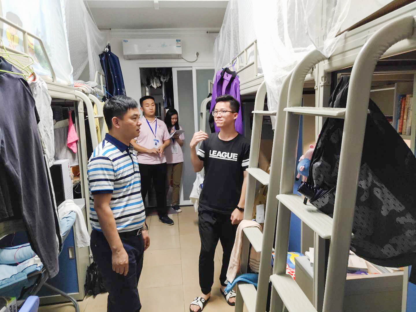 为深入贯彻学校平安广商建设的精神,落实万象城allwincity官网学生公寓管理会议的精神, 2019年5月10日傍晚七点,万象城allwincity官网党总支书记钟远辉带领政工干部、部分学生干部对本院学生宿舍进行了全面的安全、卫生检查。