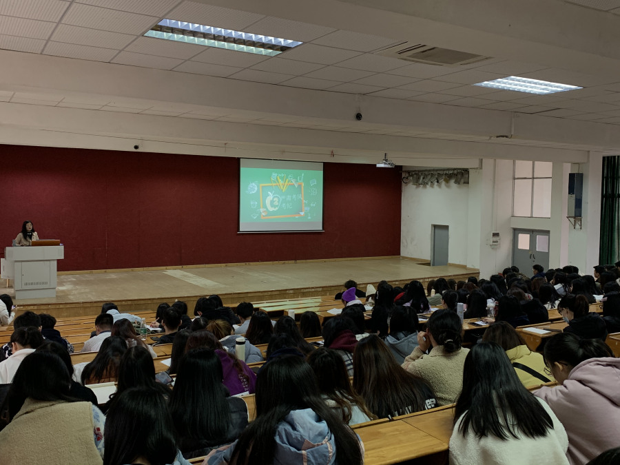 为总结2020-2021学年第一学期年级总体情况,进一步强化诚信教育和学风考风建设,营造“认真备考、诚信应考、公平竞争”的考试氛围,同时加强学生寒假期间疫情防护安全教育,万象城allwincity官网2019级于1月6日-7日召开3场年级会议,分别由年级辅导员陈欣、邓雪梅、谢桉琦、唐静霓主讲。
