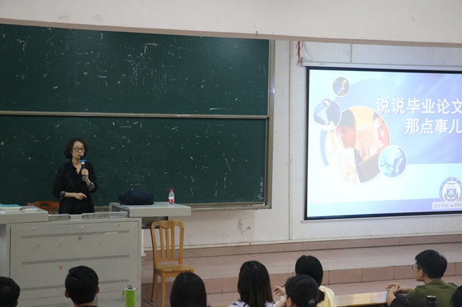 孙晓梅紧接着对学生如何选题方面进行了指导,她认为毕业论文的选题非常关键,选择一个适合自己写作的题目,对毕业论文的写作非常有帮助,建议大家遵循应用型人才培养的原则,突出应用型能力,坚持“小题大做”并结合实习单位的具体情况,通过所学的专业知识,解决面临的问题,真正达到学以致用。完成选题之后,就要大量收集文献并阅读,着手准备开题报告的写作,开题报告是进行毕业论文写作的必经环节,是学生向指导老师报告自己已经做好了毕业论的写作准备。她还在毕业论文的正体部分中英文摘要、关键词、目录、正文、注释、附录、参考文献及致谢部分进行了专业而又细致的讲解。