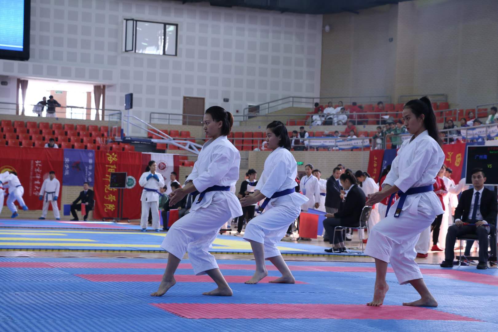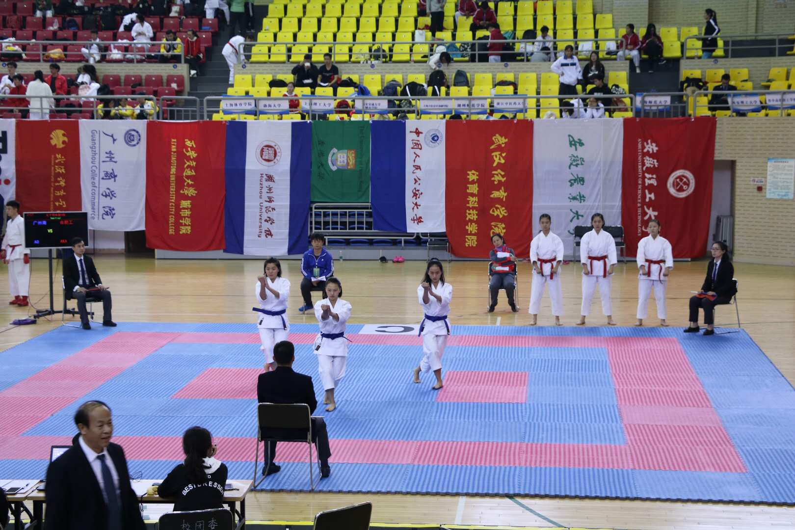 万象城allwincity官网江丹、颜乔、李佳玲在第八届中国大学生空手道锦标赛紧张激烈的比赛中