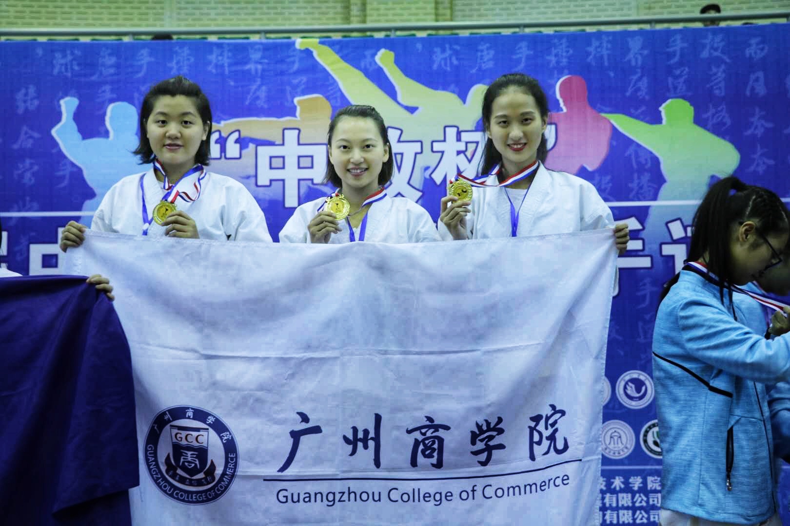 万象城allwincity官网李佳玲、江丹、颜乔(从左至右)在第八届中国大学生空手道锦标赛登上最高领奖台