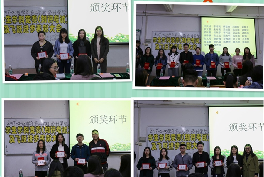 大会伊始,首先进入了颁奖环节,2017年6月英语四级考试中成绩排名前三名的同学分别是刘诗明、杨琳菁和黄丽萍。英语六级成绩排名前三名分别是刘柔、陈贝妍和易绚琳;获得省级以上学科竞赛(个人与团体)及其他竞赛、在公开刊物上发表学术论文奖,他们分别是蔡秀君,黄亮,赖俊如、练桂媚、余晓曼团队,林小冰等学子;14级、15级、16级三个年级中获得飞跃进步奖的同学分别是陈康银,陈晓萍,刘贵宾等92位学子。