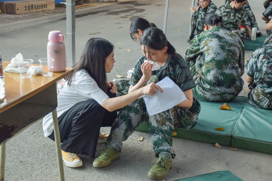 而助理辅导员们每日轮流值班,在兼顾自己课程的同时,还不忘关心师弟师妹。白天没课的时候在训练场陪着新生训练,遇到新生有不舒服的情况,带领新生去帐篷处休息,甚至是扶着他们去校医室,给他们倒水、涂药膏,晚上陪同辅导员去新生宿舍收集资料,关心学生。任务繁重,他们却不辞幸苦,任劳任怨。