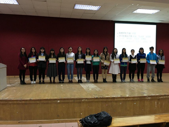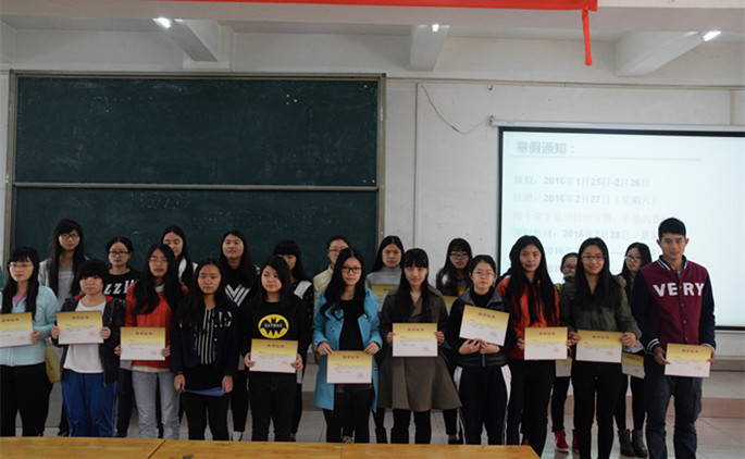 大会第一项内容是14级各班班长就这学期以来各班情况进行总结:一方面通过图片演示,给同学们回顾了班级活动;另一方面通过记录统计,总结了班级学习生活的具体情况。随后辅导员通过数据从会从通过率、四级通过人数、班级出勤率和宿舍违规情况四个方面,对全级各班情况进行总结发言。接下来,大会进行了对优秀集体、优秀个人的颁奖环节。首先得到表彰的是在2014—2015年度第二学期课室清洁评比的获奖班级和个人。其次进行了对学院评优获评个人的表彰。在上一学年的学院评优中,会计系14级有5人被评为“优秀学生干部”、52人被评为“学习积极分子”、11人被评为“文体积极分子”、20人被评为“社会工作积极分子”、5人被评为“科研积极分子”。随后辅导员强调了学校严抓考风考纪的坚定立场,呼吁每一位学生严格遵守考试纪律,共同营造文明、公平、公正的考试风气。就即将到来的寒假,明确了放假时间与返校注册日,建议同学们利用假期完成好社会实践任务。并进行了宿舍安全、假期安全、防诈骗等安全教育。