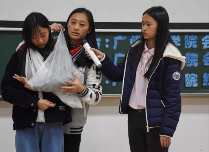 首先,红十字协会黄彩莹就擦伤、急性肠胃炎、胃疼、心肺复苏等较为常见的突发事件急救处理知识进行深入浅出的讲解。她针对不同的常发病状,提出来正确的伤口处理步骤,提醒同学们病状对应药物的注意事项,避免后患。随即她现场向我们演示了三角形包扎,并做了详细的说明以及相关的注意要点。临近尾声,通过一段演讲视频,让同学们对救护的认识更为深刻。最后,梁亮老师对本次培训进行总结,并表示自己也从中学到了许多安全救护的知识。希望同学们掌握好安全救护知识,在遇到危急之时沉着应对,使自己或他人得到恰当的救助。并叮嘱同学们要将救护的知识和理念传播下去,能够积极向身边的人传播救护知识,在帮助自己的同时也能够帮助他人,共同建造和谐校园、和谐社会。