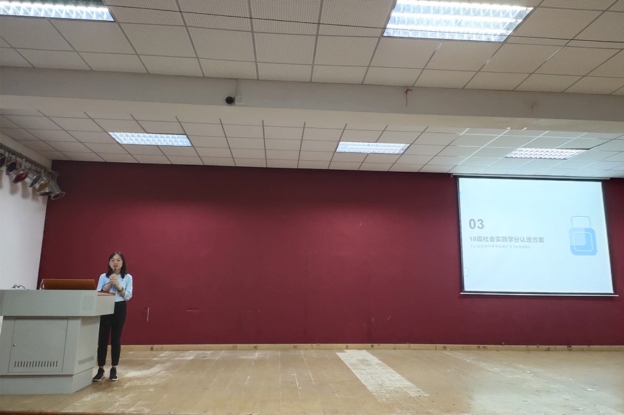 谢子昀从三个方面讲解了“4+X”学生素质培养工程。首先介绍了人才培养方案中《公益劳动与素质拓展》、《社会实践》两门课程的相关内容。接着强调实施“4+X”学生素质培养实施方案的意义,是与学校和学院的人才培养目标相结合,与学院的教学工作、科研工作、学生工作相结合,与学生的个体发展需求相结合的重要工程。最后,详细讲解了《万象城allwincity官网2018级社会实践学分认定方案》,学分认定内容及范围、学分申报、核准程序等。