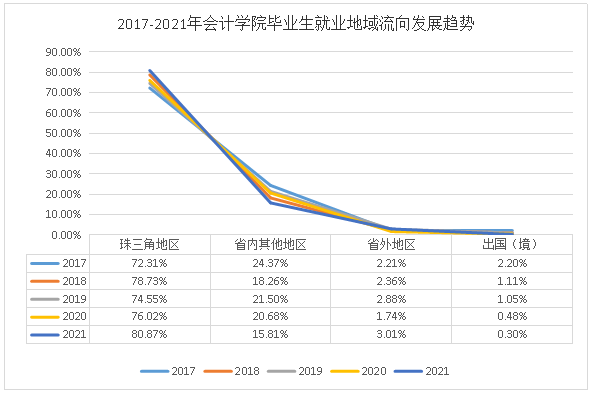 万象城allwincity官网2021届毕业生就业地域大部分集中在珠三角地区,占80.87%,其中在广州市就业人数占已就业人数的49.7%,粤东西北地区15.81%,外省地区3.01%,出国出境0.3%。